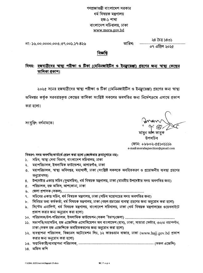 এ সংক্রান্ত যে কোনো তথ্যের জন্য ১৬১৩৬ নম্বরে যোগাযোগ করতে বলা হয়েছে। ধর্ম বিষয়ক মন্ত্রণালয়ের হজ-১ শাখা থেকে এ বিষয়ে একটি বিজ্ঞপ্তি জারি করা হয়েছে।