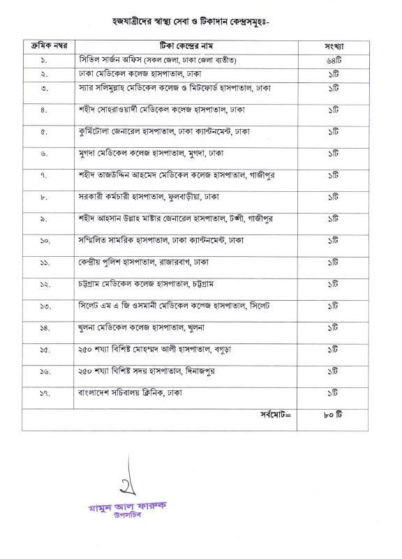 হজযাত্রীরা মোট ৮০টি স্বাস্থ্য সেবা ও টিকাদান কেন্দ্র হতে টিকা গ্রহণ করতে পারবে। কেন্দ্রগুলোর মধ্যে রয়েছে সকল জেলার সিভিল সার্জন অফিস। এ ছাড়া, ঢাকার জেলার ঢাকা মেডিকেল কলেজ হাসপাতাল, স্যার সলিমুল্লাহ মেডিকেল কলেজ ও মিটফোর্ড হাসপাতাল, শহীদ সোহরাওয়ার্দী মেডিকেল কলেজ হাসপাতাল, কুর্মিটোলা জেনারেল হাসপাতাল, সম্মিলিত সামরিক হাসপাতাল, সরকারি কর্মচারী হাসপাতাল, ফুলবাড়িয়া, মুগদা মেডিকেল কলেজ হাসপাতাল, কেন্দ্রীয় পুলিশ হাসপাতাল, রাজারবাগ, বাংলাদেশ সচিবালয় ক্লিনিক, গাজীপুরের শহীদ তাজউদ্দিন আহমেদ মেডিকেল কলেজ হাসপাতাল ও শহীদ আহসান উল্লাহ মাস্টার জেনারেল হাসপাতাল, চট্টগ্রাম মেডিকেল কলেজ হাসপাতাল, সিলেট এম এ জি ওসমানী মেডিকেল কলেজ হাসপাতাল, খুলনা মেডিকেল কলেজ হাসপাতাল, বগুড়া ২৫০ শয্যা মোহাম্মদ আলী হাসপাতাল ও দিনাজপুর ২৫০ শয্যা সদর হাসপাতাল।